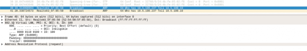 As you see in the figure above, You can see the frame 802.1q section. Which means vlan configured successfully.