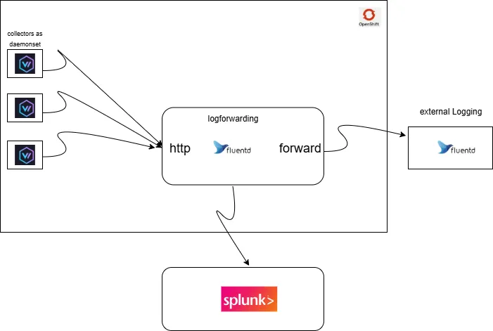 To achieve this, we’ll introduce an additional Aggregator component (via Log Forwarding), shown in the diagram below. This component receives OpenShift/Kubernetes logs over HTTP, applies necessary transformations, and then forwards them to external logging systems — such as those using Fluentd Forward or SIEM solutions like Splunk.